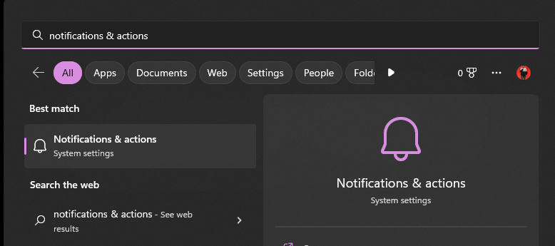 1。を押します勝つキー、検索、および開きます通知とアクションメニュー。