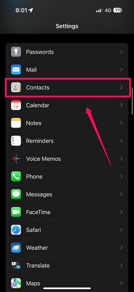 2。を見つけます連絡先リストの設定とタップして開くようにします。
