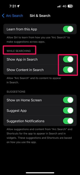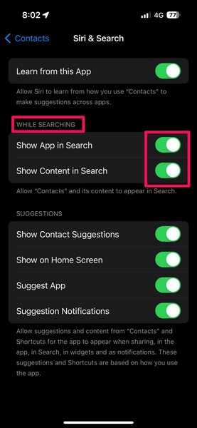 4。ここで、検索中セクション、のトグルを確認してください検索でアプリを表示しますそして検索でコンテンツを表示しますiPhoneで有効になっています。