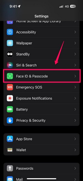 2。を見つけますフェイスIDとパスコードリストの設定とタップして開きます。