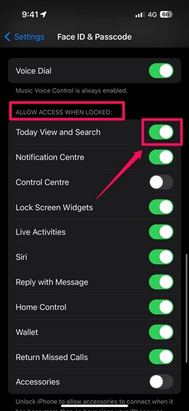 4。に下にスクロールしますロックされているときにアクセスを許可しますセクションと、のトグルを確認します今日は表示と検索ですオプションはです有効になっていますデバイスで。