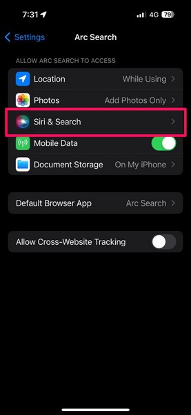 3。タップしますSiri&Searchアプリセッティングページのオプション。
