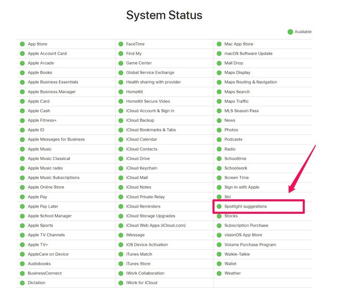 に問題がある場合スポットライトの提案サーバーの地域では、Spotlight検索では、iPhoneで開くときにアプリの提案を表示できません。だから、私たちはあなたが行くことをお勧めしますAppleの公式システムステータスページまた、スポットライトの提案サーバーがお住まいの地域でアクティブであることを確認してください。