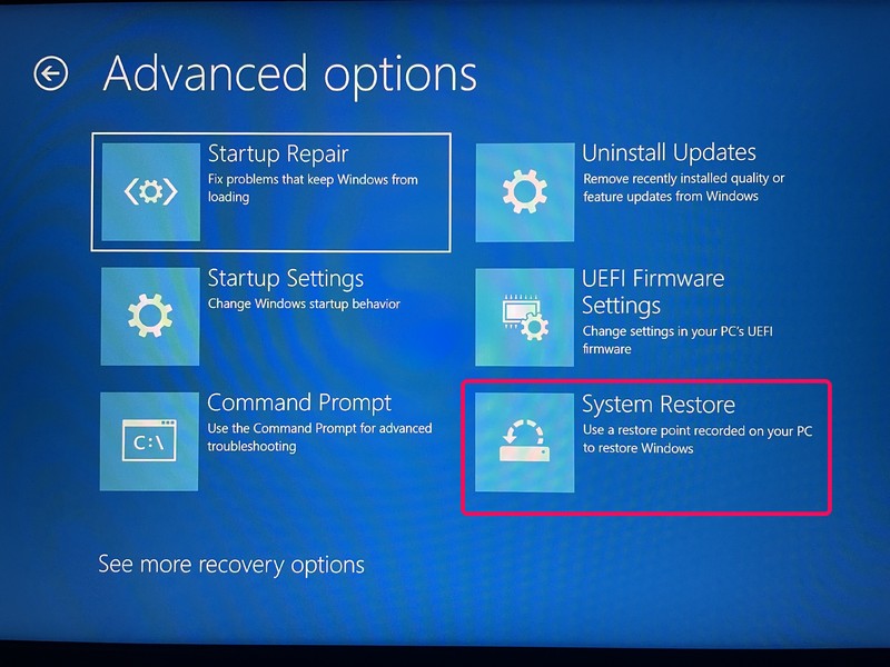 5。に高度なオプション画面、選択しますシステムの復元次の画面に移動するオプション。