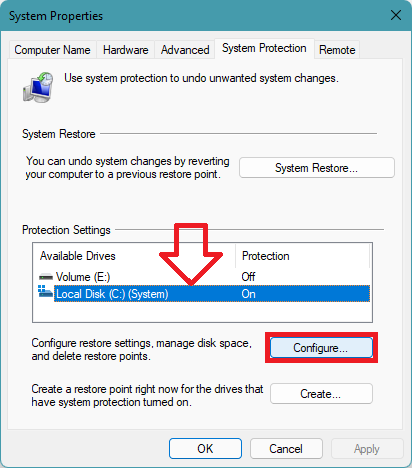 2。下保護設定、を選択します設定しますシステムを変更するボタン設定を復元します。
