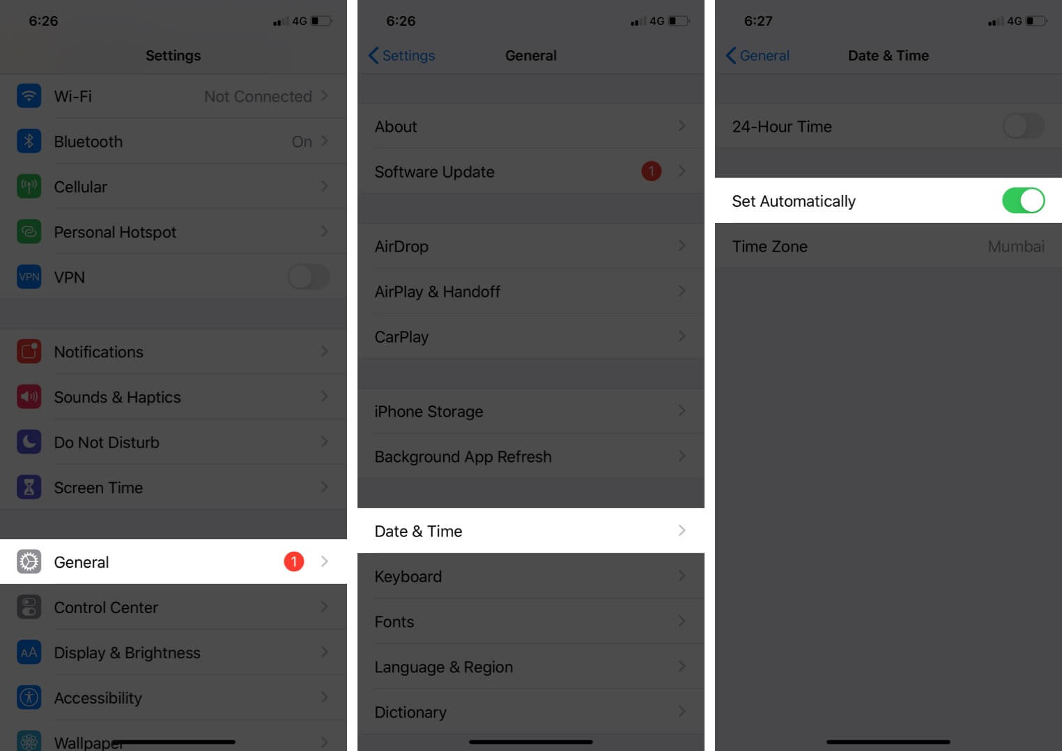 行きます設定→一般的な→日付と時刻。オンに切り替えますセット 自動的に。