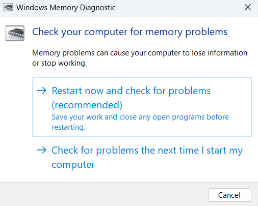 問題がシステムメモリにある場合、Windowsメモリ診断ツールは潜在的な問題を特定し、それに応じてアクションを実行するように促します。ツールを実行する -
