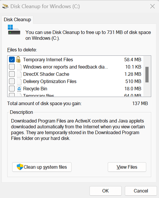 TEMPフォルダーには破損したデータが含まれています。これは、エラー1152のもう1つの既知の原因です。この問題を解決するには、フォルダーに保存されているデータをクリアできます。 。 Windowsシステム用のデフォルトのクリーンアッププログラムは、ディスククリーンアップと呼ばれます。そのアプリケーションを使用すると、一時的なファイルに加えて、多くの不要なファイルを削除できます。これは、Windows 11のディスククリーンアップが一時ファイルを削除する方法です。