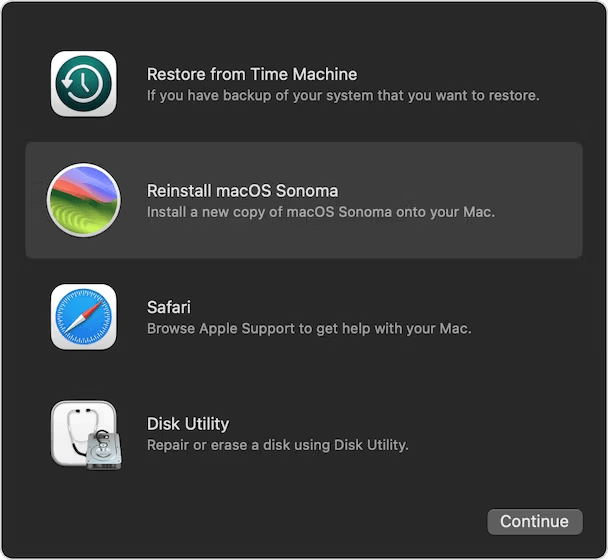 ステップ3:[オプション]をクリックすると、MacOSユーティリティにアクセスします。 「macosを再インストールする」を選択し、画面上の命令に従ってください。