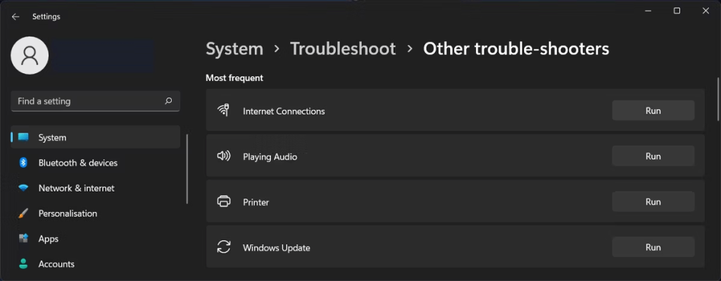 ステップ3:次に、選択しますその他のトラブルシューター右のパネルから。