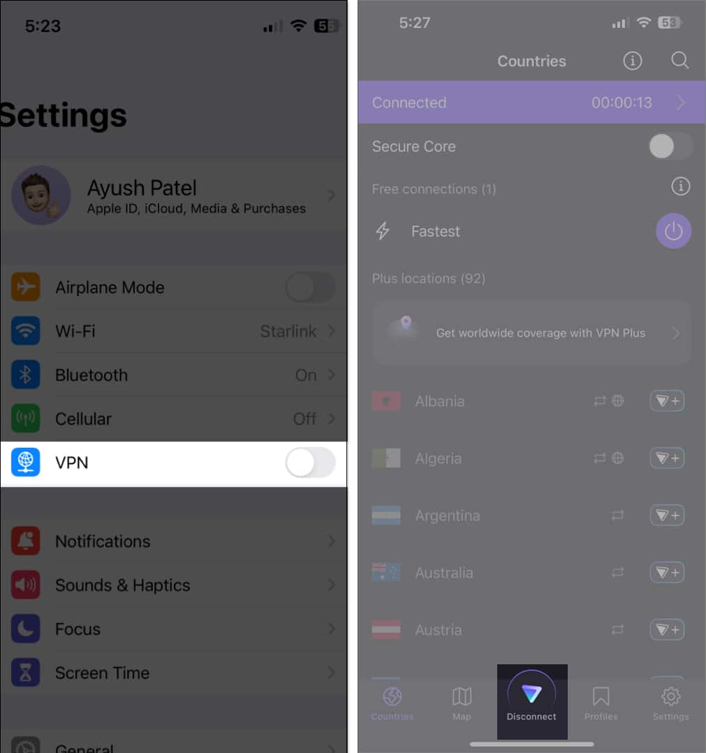 3. iPhoneがVPNに接続されていないことを確認してください