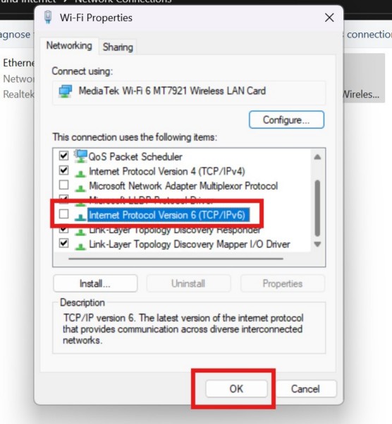 6。次のウィンドウで、を見つけますインターネットプロトコルバージョン6(TCP/IPv6)オプションそして無効にするためにチェックボックスをクリックします。クリックしますOKボタン変更を保存するため。