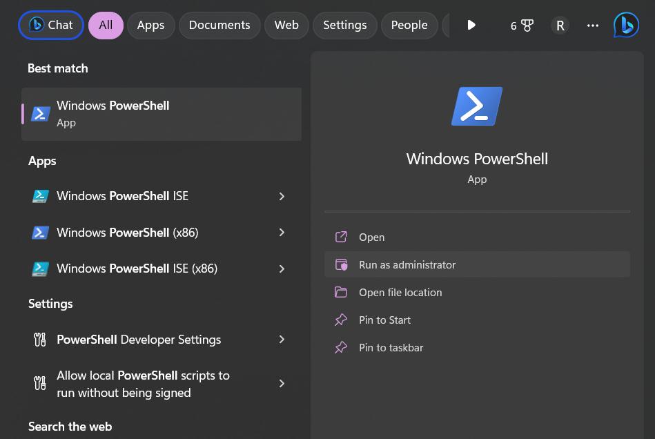 ステップ1:タスクバーに配置された検索アイコンをタップし、「PowerShell」と入力し、「管理者として実行」オプションを選択して、Adminモードでアプリを起動します。
