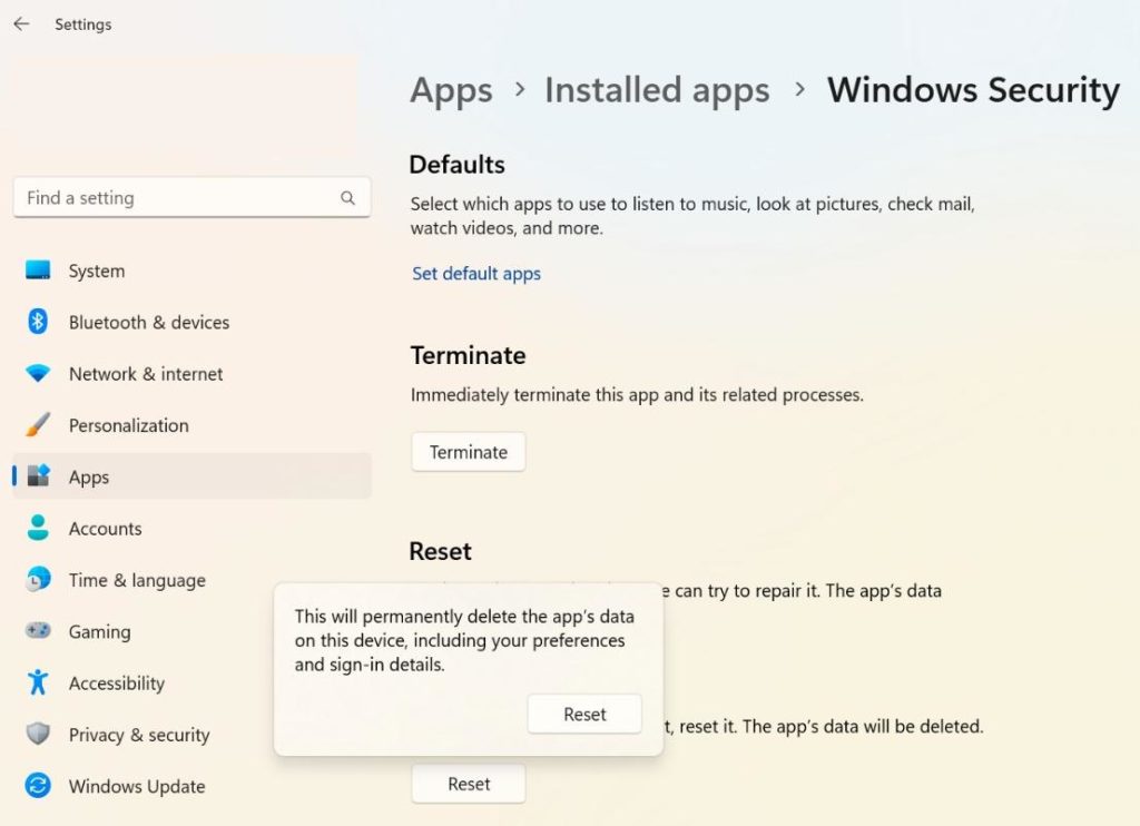 Windows 11の「この設定は管理者によって管理されています」という問題は、Windowsセキュリティ設定のバグにより発生する可能性があります。したがって、Windowsセキュリティアプリをリセットすることは、あなたのために驚異的に機能し、この問題を解決する可能性があります。ここにそれを進めるためのステップがあります: