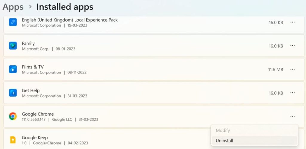 ステップ3:のリストインストールされたアプリ画面で開きます。アンインストールするアプリ名の横にある3つのドットをクリックしてから、選択しますアンインストール。