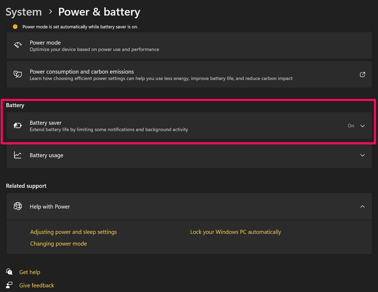 Windows 11の透明度効果が機能しない別の一般的な理由は、バッテリーセーバーモードです。 Windows 11のバッテリーセーバーモードは、特定の状況でラップトップユーザーに本当に役立つシステム機能です。ただし、デバイスの電源を節約するために、バッテリーセーバーモードは、追加のバッテリー電源を使用する可能性のあるすべてのエフェクトと設計材料を本質的に無効にします。