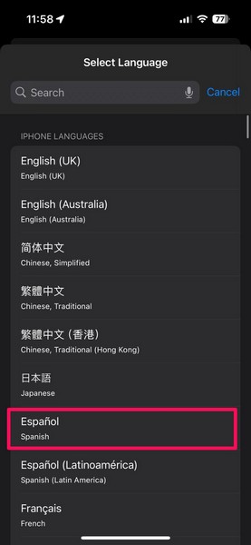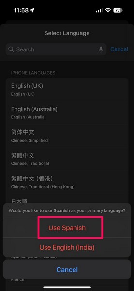 7。タップします[言語]ボタンを使用しますあなたの行動を確認します。選択した言語をプライマリiPhone言語として設定した後、デバイスが再スプリングする場合があります。