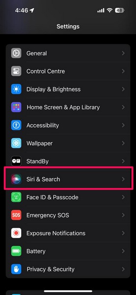 2。を見つけますSiri&Searchリストのオプションとタップして開きます。