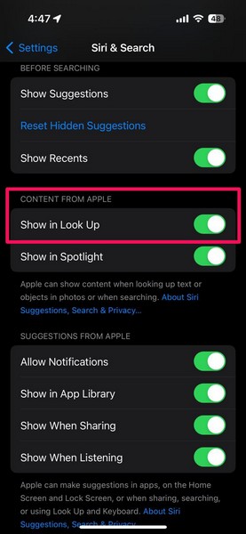 4。さて、確認してくださいLook Upオプションのショーのトグルが有効になっていますあなたのiPhoneで。