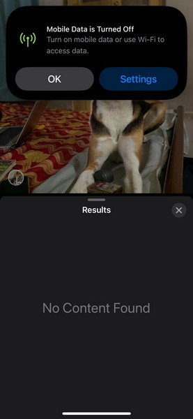 したがって、iPhoneがアクティブで安定したインターネットネットワークに接続されていない場合、機能は機能しません。 「I」ボタンがサポートされている画像の視覚的な検索アイコンにターンするのが表示されますが、タップすると「コンテンツが見つかりません」エラーのみが表示されます。また、iPhoneは、インターネットに接続するためにモバイルまたはセルラーデータをオンにするように促す場合があります。