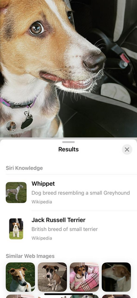 同様に、視覚的な検索機能は、動物、食べ物、アートワーク、本、その他のさまざまなオブジェクトを識別できます。実際、食品を識別すると、iPhoneの写真アプリに同様のレシピを表示できます。さらに、犬や猫などの動物の場合、視覚的な検索は品種を識別します。画像とは別に、Visual Look Upは、一時停止したときに動画でも機能します。