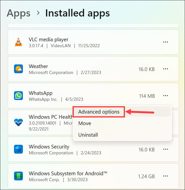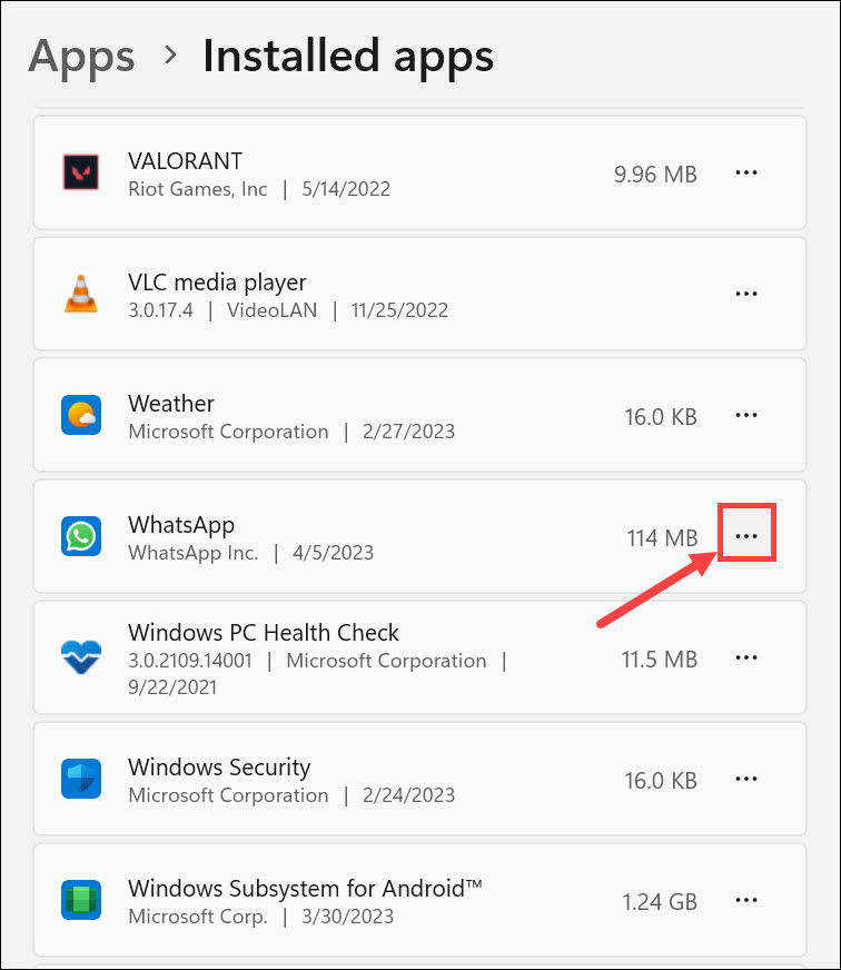 3。WhatsAppアプリを探して、その横にある「3つのドット」をクリックします。