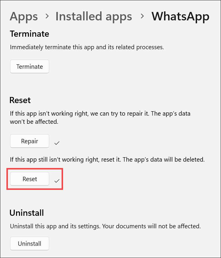 6。システムはWhatsAppアプリの修理を開始し、完了した後、修理ボタンの横にティックマークがあります。