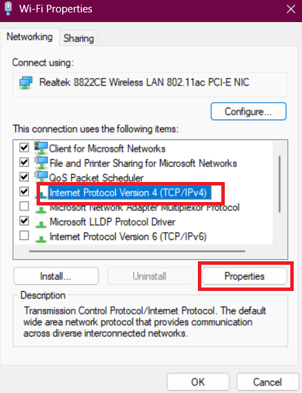 4。Wi-Fiプロパティセクションで、選択しますインターネットプロトコルバージョン4(TCP/IPv4)、そしてクリックしますプロパティオプション。