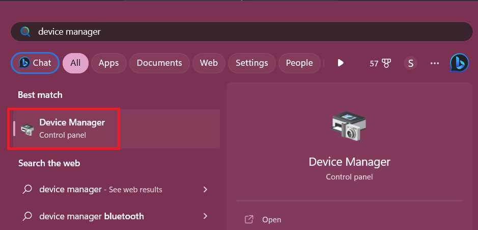 1。検索と開いてくださいデバイスマネージャ[スタート]メニューの検索バーを使用した設定。