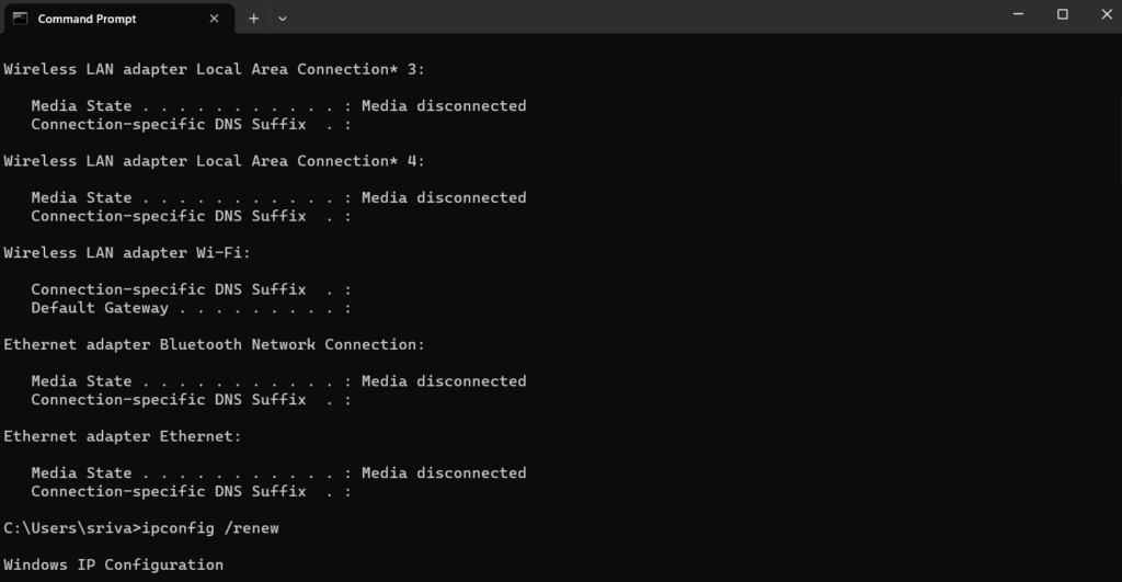 ipconfig /releaseコマンドは、コンピューターにIPリースを放棄するように強制します。 DHCPリリース通知をサーバーに送信することにより、ipconfig /renewコマンドは、サーバーから新しいIPアドレスを要求します。新しいIPアドレスが有効な場合、コンピューターはエラーが表示されなくなりますが、そうでない場合は、IPアドレスをもう一度更新してみてください。