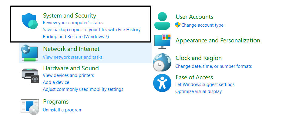 2。次に、を選択しますシステムとセキュリティオプションしてから、に移動しますWindows Defenderファイアウォール関数。