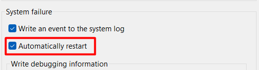 6。隣の箱を整えます自動的に再起動しますのチェックボックスシステム障害セクション。