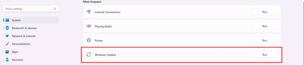 3。次の画面で、下最も頻繁です、クリックします走る隣のボタンWindows Update。