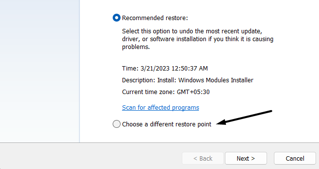 3。復元ポイントを選択し、をクリックします次に>プロンプトの下部にあるオプション。