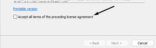 3。Microsoft Safety ScannerのEXEファイルがダウンロードされたら、クリックしてからチェックしてください前のライセンス契約のすべての条件を受け入れます箱。