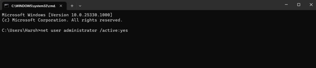 3。を押します入力キーボードのキーは、システム上の非表示の管理者アカウントをオンにします。