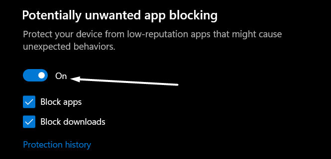 「Windowsが指定されたデバイスパスまたはファイルにアクセスできない」エラーを削除する方法の1つは、潜在的に不要なアプリブロッキングを無効にしますWindowsシステムのオプション。
