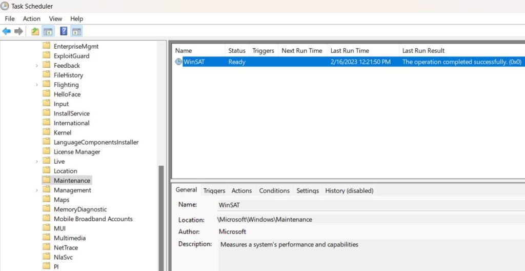 Task Scheduler > Task Scheduler Library > Microsoft > Windows > Maintenance.