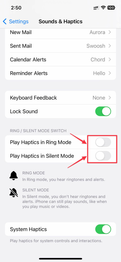 3。下にスクロールして、次のトグルをオフにしますリングモードで触覚を再生しますそしてサイレントモードで触覚をプレイします。