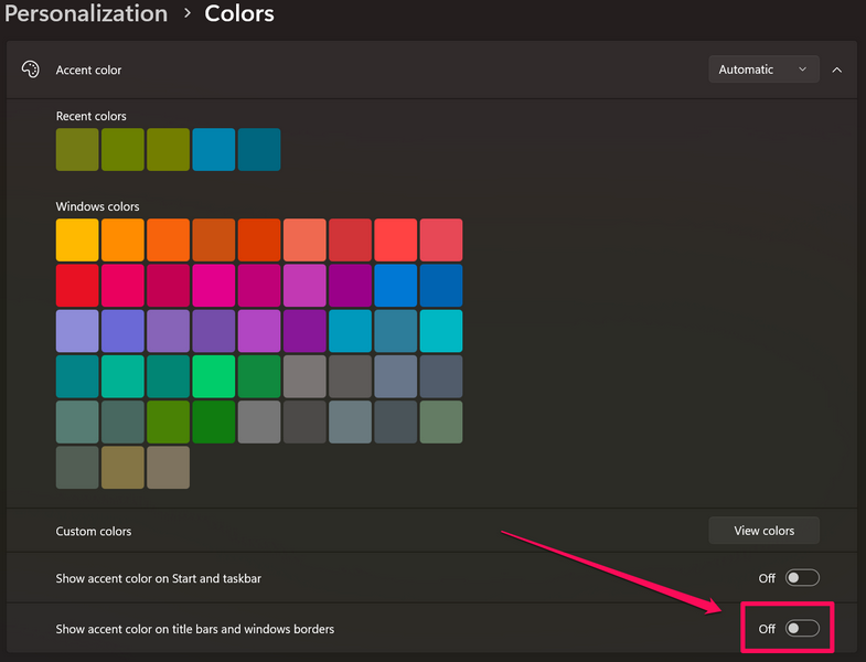 4。無効にしますタイトルバーと窓の境界にアクセントの色を表示しますその横にあるトグルをクリックしてオプション。