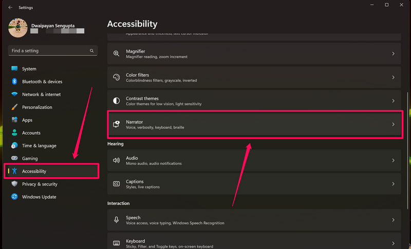 2。に行きますアクセシビリティ左ナビゲーションバーのタブをクリックしますナレーター右ペインのオプション。