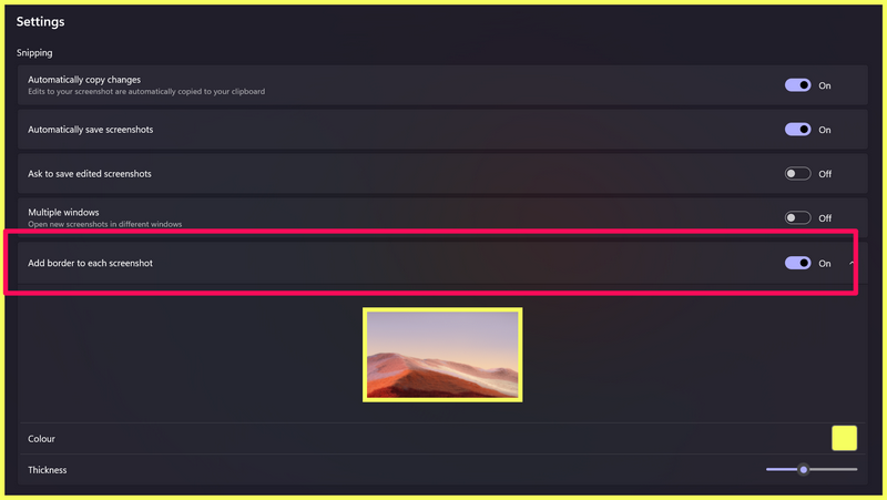 4。スニッピングツール設定ページには、各スクリーンショットに境界線を追加しますオプションが有効になっています。