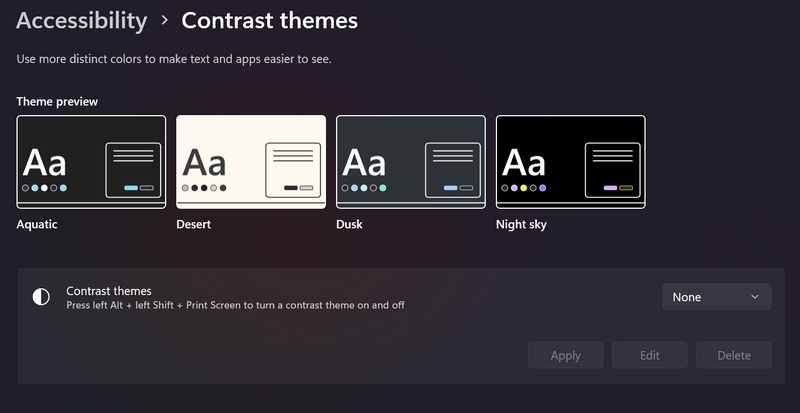 5. Windows11でコントラストのテーマが無効になっていることを確認してください