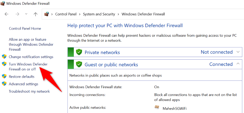 - 選ぶWindows Defenderファイアウォールをオンまたはオフにします左側のサイドバー。