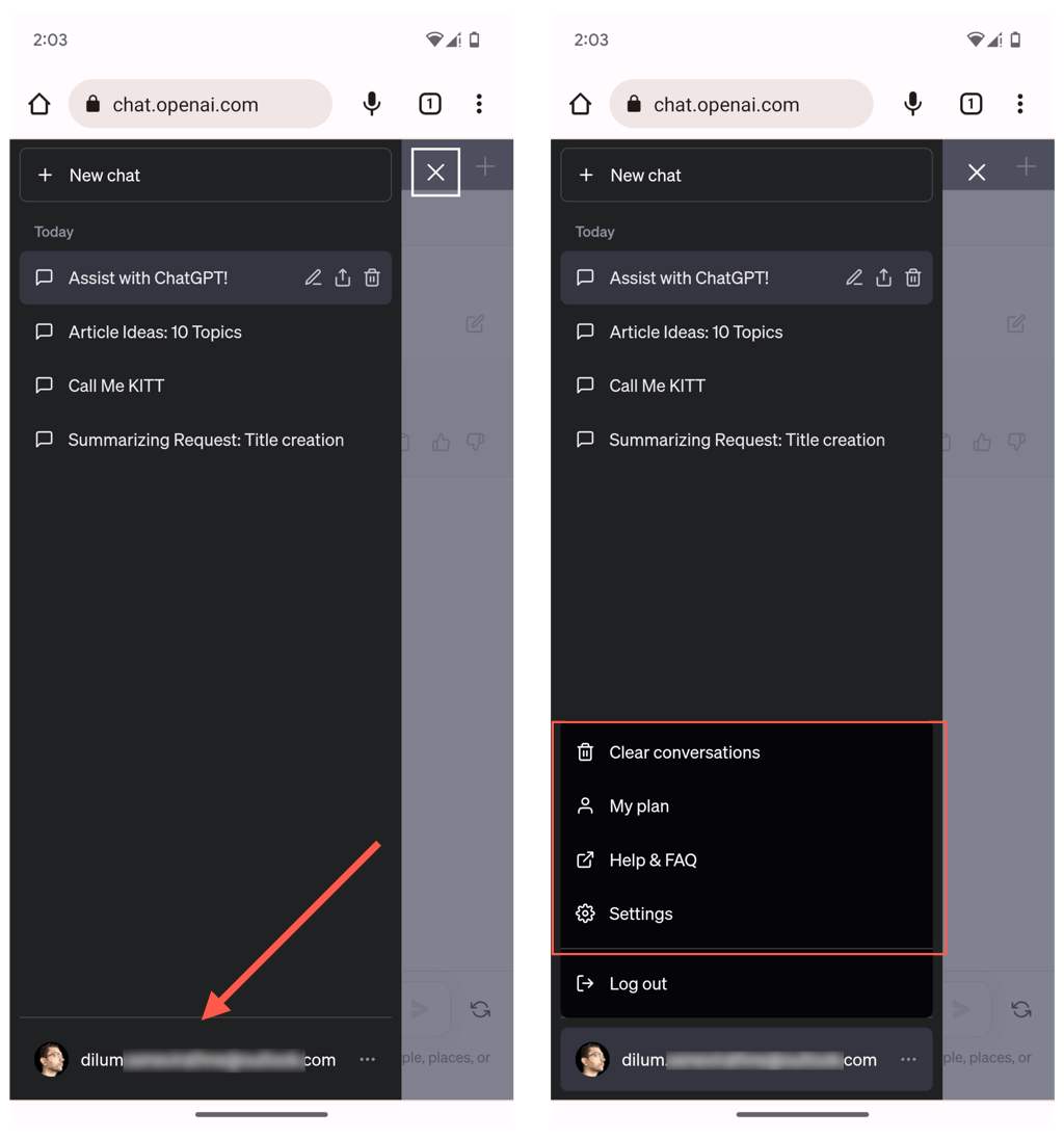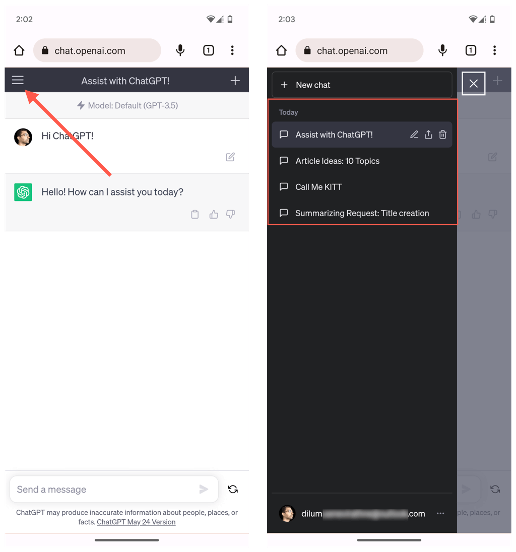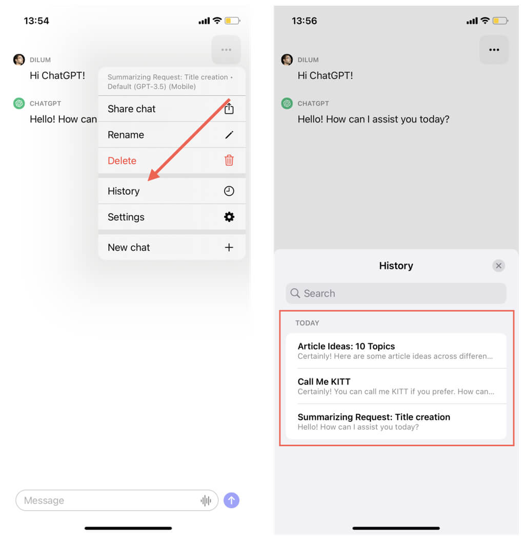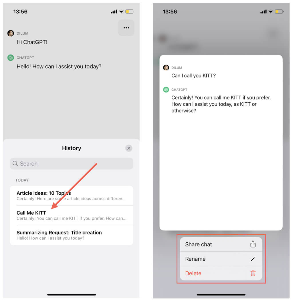 ChatGPTメニュー(3つの積み重ねられた行でアイコンをタップ)を開き、会話リストにアクセスします。また、チャットリスト内の関連するボタンをタップすることにより、会話を削除、共有、または名前を変更することもできます。