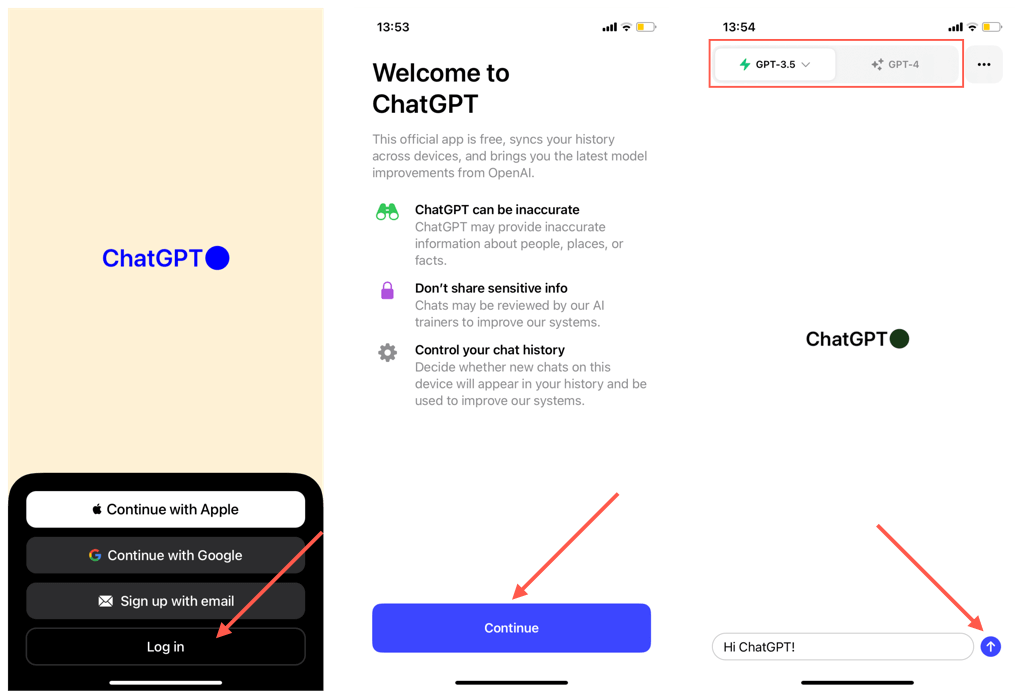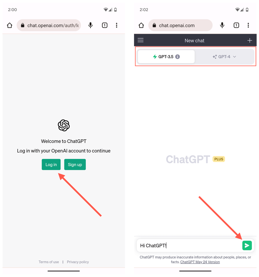 - プロンプトをチャットボックスに挿入してタップします送信chatgptとのチャットを開始するアイコン。 ChatGpt Plusサブスクライバーの場合、画面上部から言語モデルを切り替えることができます - EG、GPT-3.5、またはGPT-4。