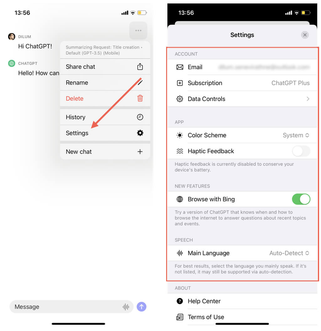 - タップします設定一般的な設定にアクセスするには(テーマの好みなど)、ベータ機能(例、ビングで閲覧)、データコントロール(たとえば、トレーニングで使用するチャット履歴、共有リンクの管理、データのエクスポートを許可します)。