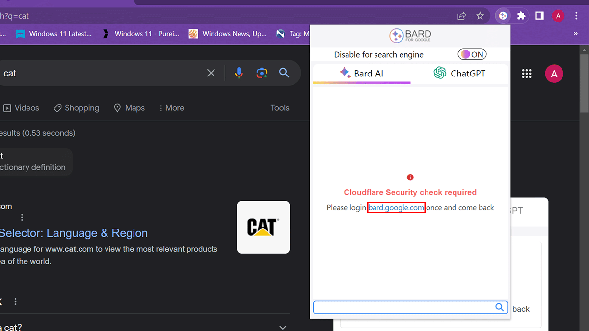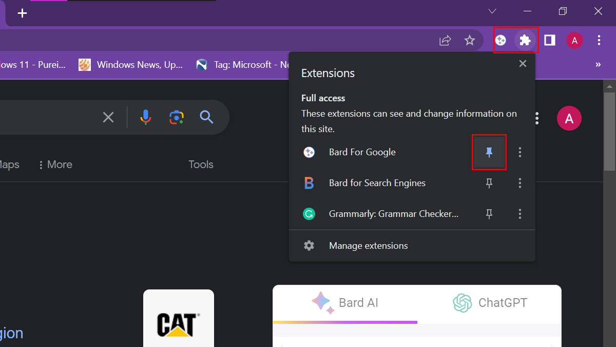 - 開きます拡張機能右上隅のメニュー>ピンGoogleのバード拡大。
