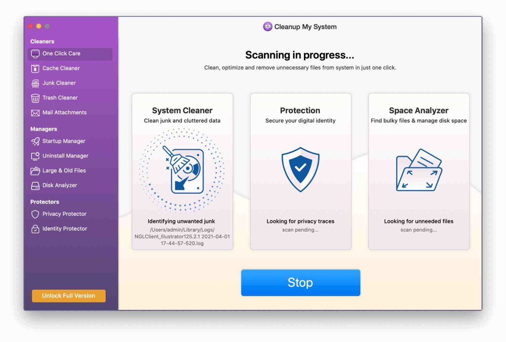 私のシステムのクリーンアップは、スナピアでより応答性の高いMacのためのワンストップソリューションです。このプロフェッショナルチューニングツールは、システムを遅くしている厄介な犯人をターゲットにするように設計されています。 1回のクリックで、adieuをジャンクファイル、あなたの重さを量っている不要なメール添付ファイル、そして貴重なスペースを抱きしめている大規模で古いファイルを忘れたものに入れることができます。