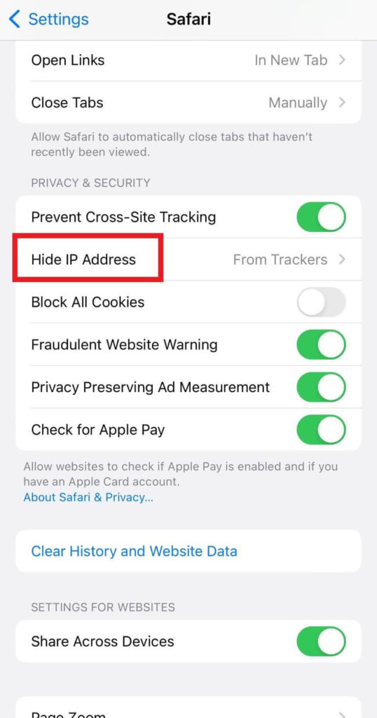 - Safariページでは、「プライバシーとセキュリティ」オプションの下で、IPアドレスを非表示にします。